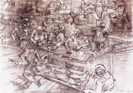> In der Baracke < Mischtechnik auf Papier, 85 x 115 cm, 1981