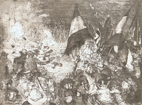 […] 50 Jahre später, 1983, gab Gisa Hausmann in zwei Kassetten mit dem Titel> IHRE WERKE WURDEN VERBRANNT UND VERGESSEN < einen umfänglichen Radierzyklus heraus, der je Kassette 20, also insgesamt 40 Blätter umfasst. Er gehört damit nicht nur im Zusammenhang mit Gisa Hausmanns eigenem graphischem Werk zu den großen thematisch zusammenhängenden Radierfolgen die hierzulande nach dem 2. Weltkrieg erschienen sind. Dass die Radierfolge 50 Jahre nach der Bücherverbrennung in Druck gegangen ist, gehört zu den bedeutungsvollen Zufällen. Gisa Hausmann hat in diesem Werk die Möglichkeiten der Radierung erweitert. Der hohe Anspruch, den das Thema stellte, ist eingelöst durch die Verschränkung von vielerlei künstlerischen Mitteln, was die besondere Qualität der Radierfolge ausmacht. […]